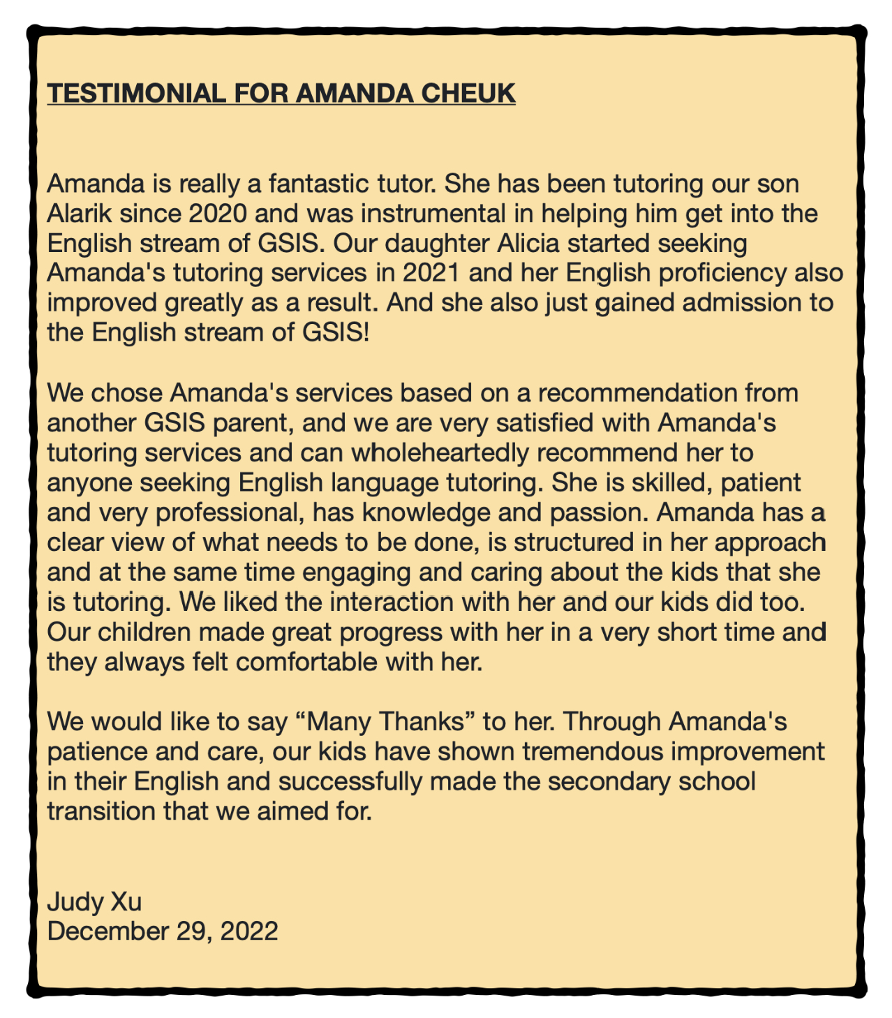 This is written to express my appreciation and gratitude to Miss Amanda Cheuk, who has been my son’s English tutor for the past four years. Under Amanda’s guidance, my son’s English ability has been greatly improved.